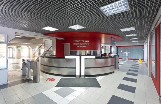 Пример брендирования входа и зоны ресепшн в бизнес-центрах: